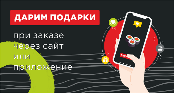 Дарим подарки при заказе через сайт и мобильное приложение. Больше сумма заказа - круче подарок! При заказе от 1000 рублей ролл: - Бансай При заказе от 1400 рублей ролл: - Аляска При заказе от 1600 рублей ролл: - Фила Суммируется только с акцией "Дисконтная карта"